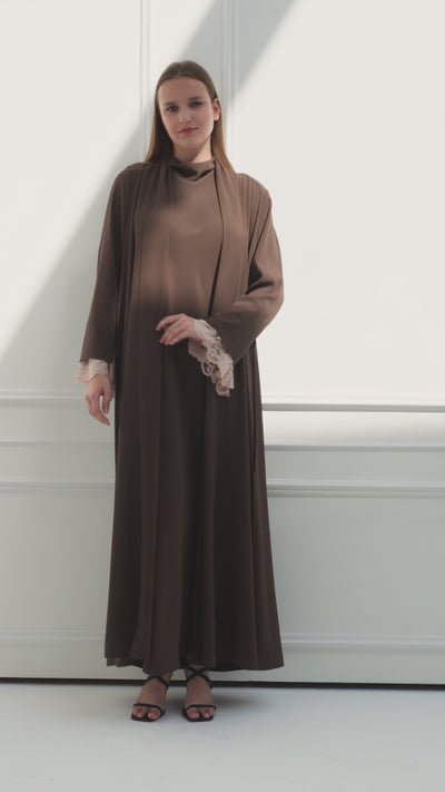 - Alunor abaya featuring a distinctive duntel cuff with pearl button detailing for an elevated, refined look.